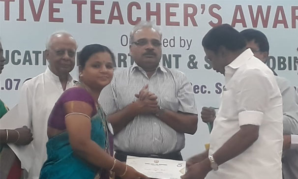 J.Vasupradha one of our primary school teachers, has been recognized by the govt of Tamilnadu and Sri Arabindo society for being an Innovative teacher. J Vasupradha was honoured at the award ceremony held by the Tamilnadu Government in Chennai on the 10th of July 2019. And the Education Minister Sri Sengottayan presented her with the award.